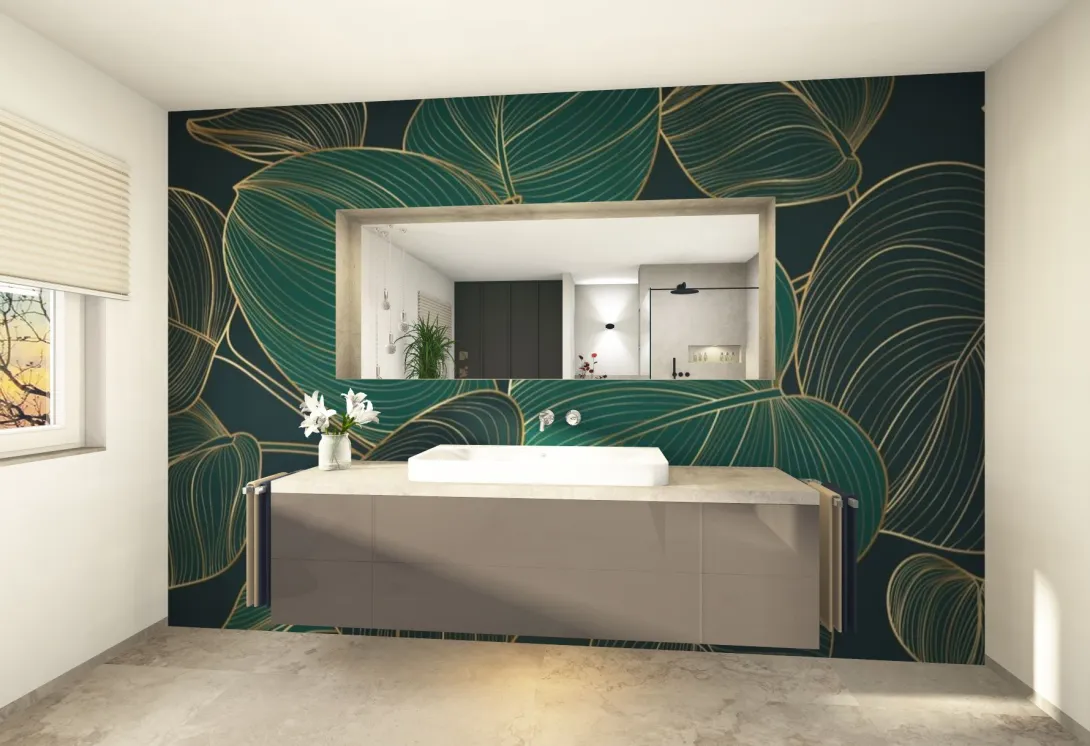 Exklusives Gäste-WC mit floraler Wandgrafik, modernem Waschtisch und indirekter Beleuchtung.