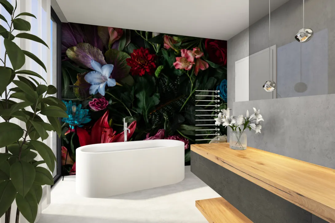 Modernes Designerbad mit freistehender Badewanne, floraler Wandgestaltung und Waschtisch mit Holzplatte.