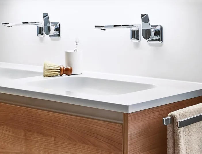 Der Doppelwaschtisch aus Mineralwerkstoff von Nolff erfüllt höchste Anforderungen in Sachen Belastbarkeit und Hygiene und überzeugt zudem mit edlem Design. Dabei kann er sich auf seinen kongenialen Partner verlassen: einem ebenfalls von Nolff gefertigten Unterschrank. Beide Elemente sind passgenau aufeinander abgestimmt und geben dem Waschplatz seinen ganz besonderen Charme. Die Wand-Einhebelmischer der Serie Lissé von Dornbracht perfektionieren das stilvolle Design-Konzept.