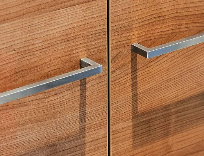 Hinter diesen beiden Griffen befindet sich jede Menge Stauraum, denn der Einbauschrank verfügt über einen geräumigen Innenbereich. Sehr gut zu sehen ist auch die fein verarbeitete Holz-Textur der Frontseite. Die Holzelemente an Decke, Waschtisch-Unterschrank und Einbauschrank stellen ein wiederkehrendes Stilmerkmal des Dachbadezimmers dar und schaffen ein wohnliches Raumambiente.