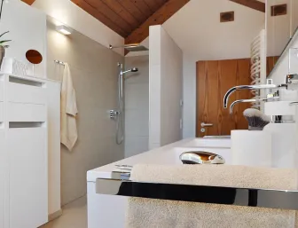 Hier ist für jedem was dabei. Die Vaia-Armaturen mit Thermostat von Dornbracht setzen filigrane Akzente und gewähren maximalen Duschkomfort. Die elegante Stabhandbrause mit Metallbrauseschlauch bietet großzügigen Bewegungsfreiraum. Der Dornbracht-Schwallauslauf eignet sich exzellent für ausgiebige Nacken-Massagen. Für gesunde Kneipp-Güsse ist zusätzlich ein Kneipp-Schlauch im Armaturen-Set integriert. Diese luxuriöse Ausstattung macht das Duschen zum vielseitigen Wellness-Vergnügen.